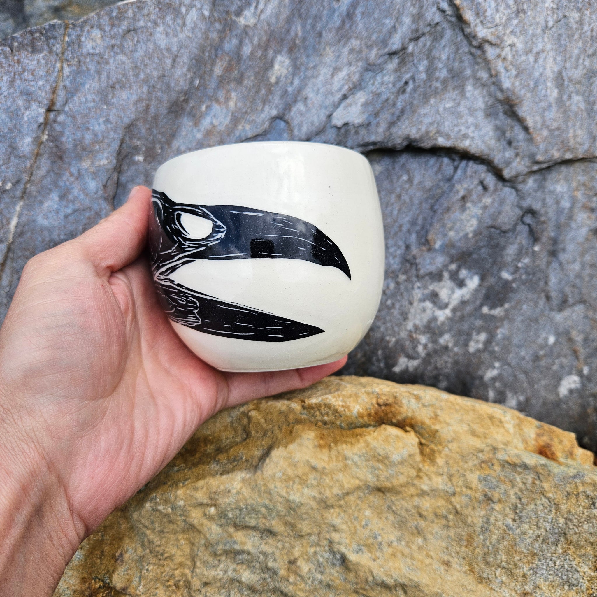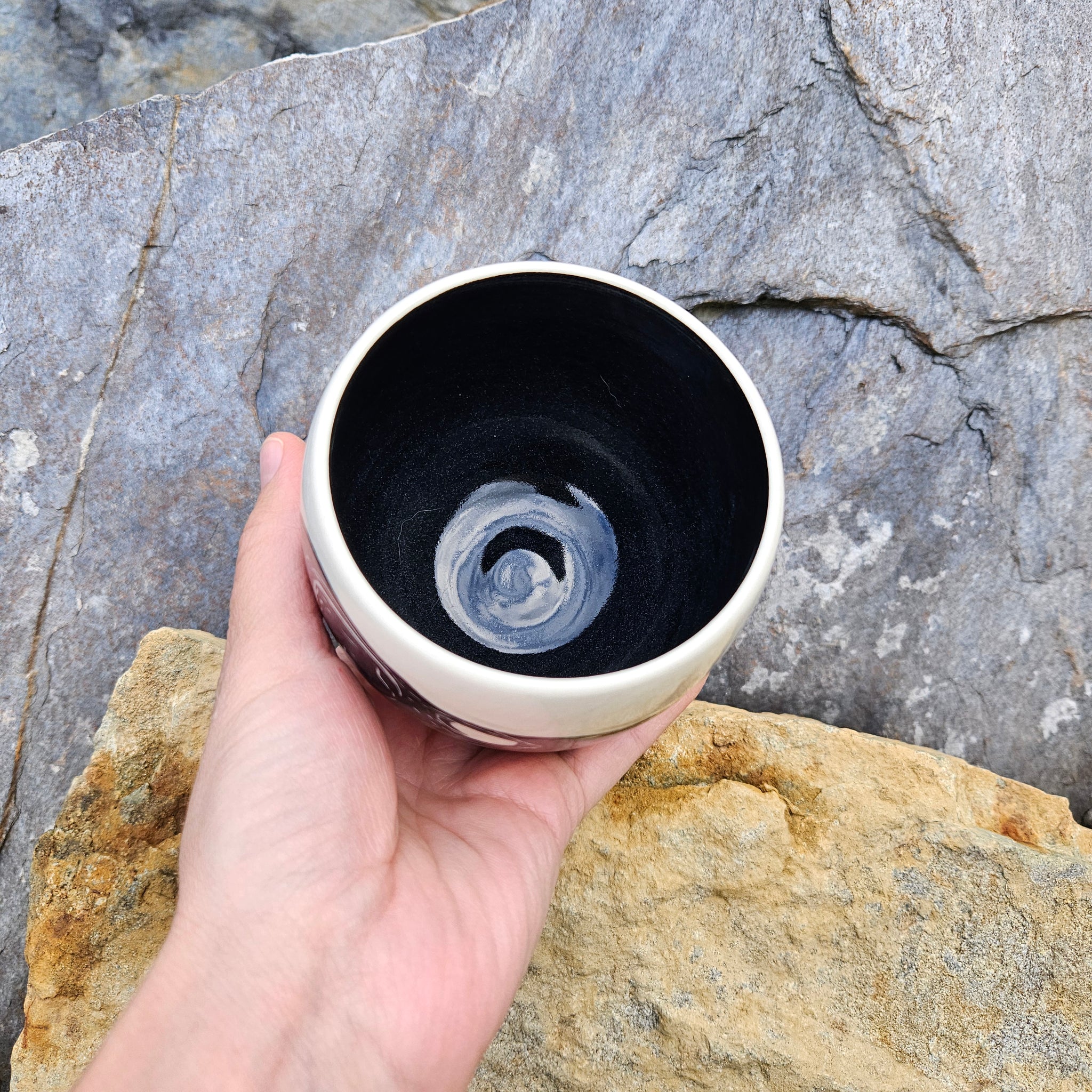 Width: 9cm. Height: 7.5cm*. Volume: 300mL or 10oz. Material: white ceramic. Black interior.