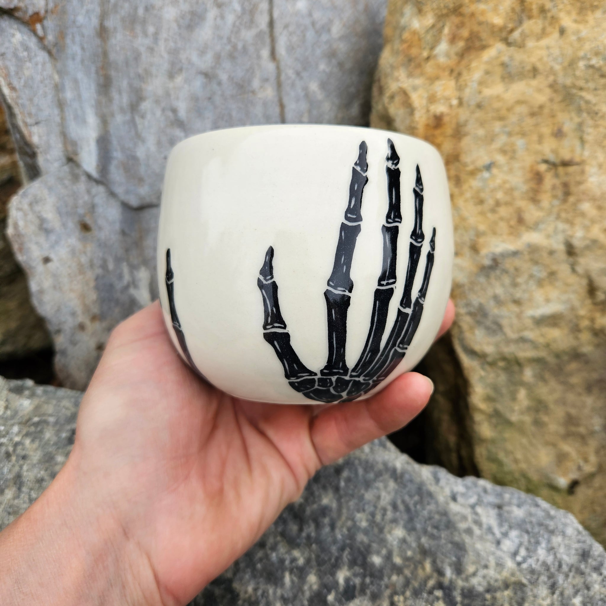A medium ceramic cup hand-carved with a two skeletal human hands.