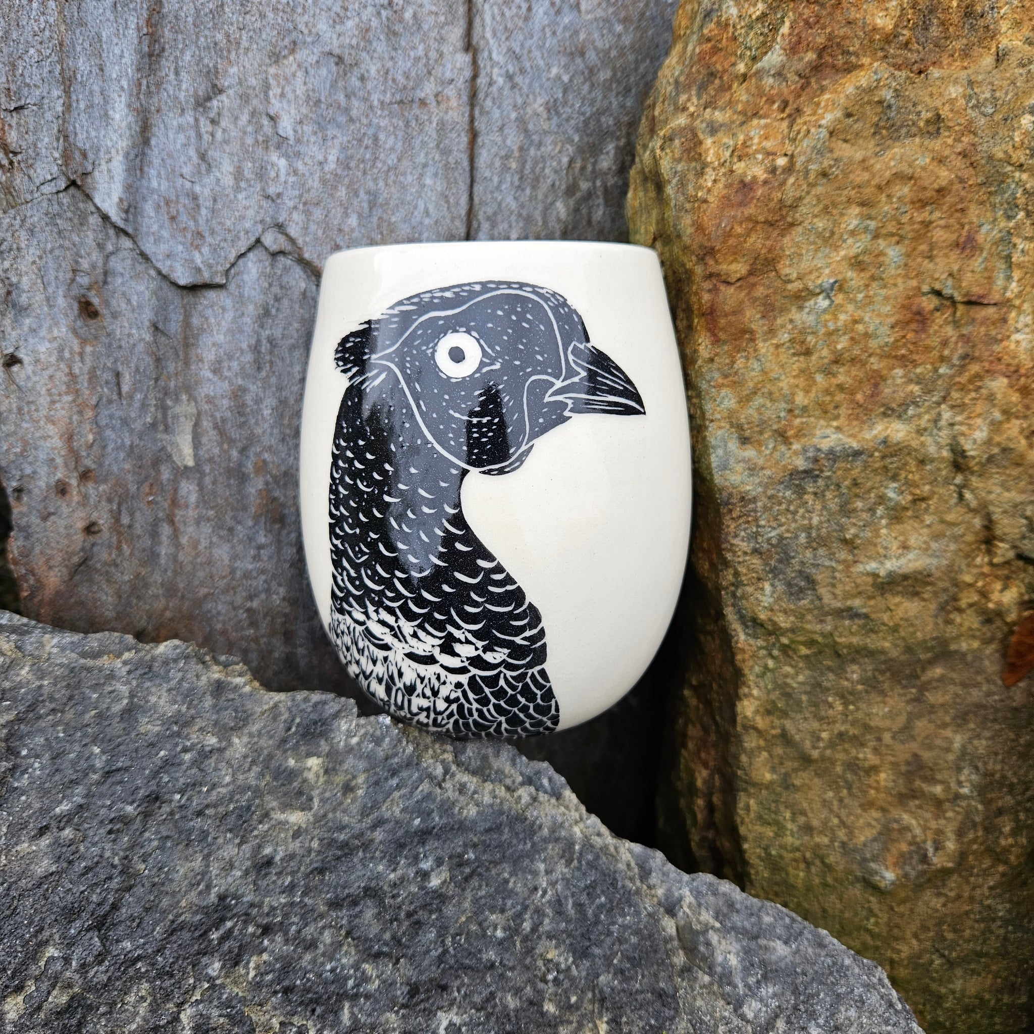 A large ceramic cup hand-etched with a pheasant.