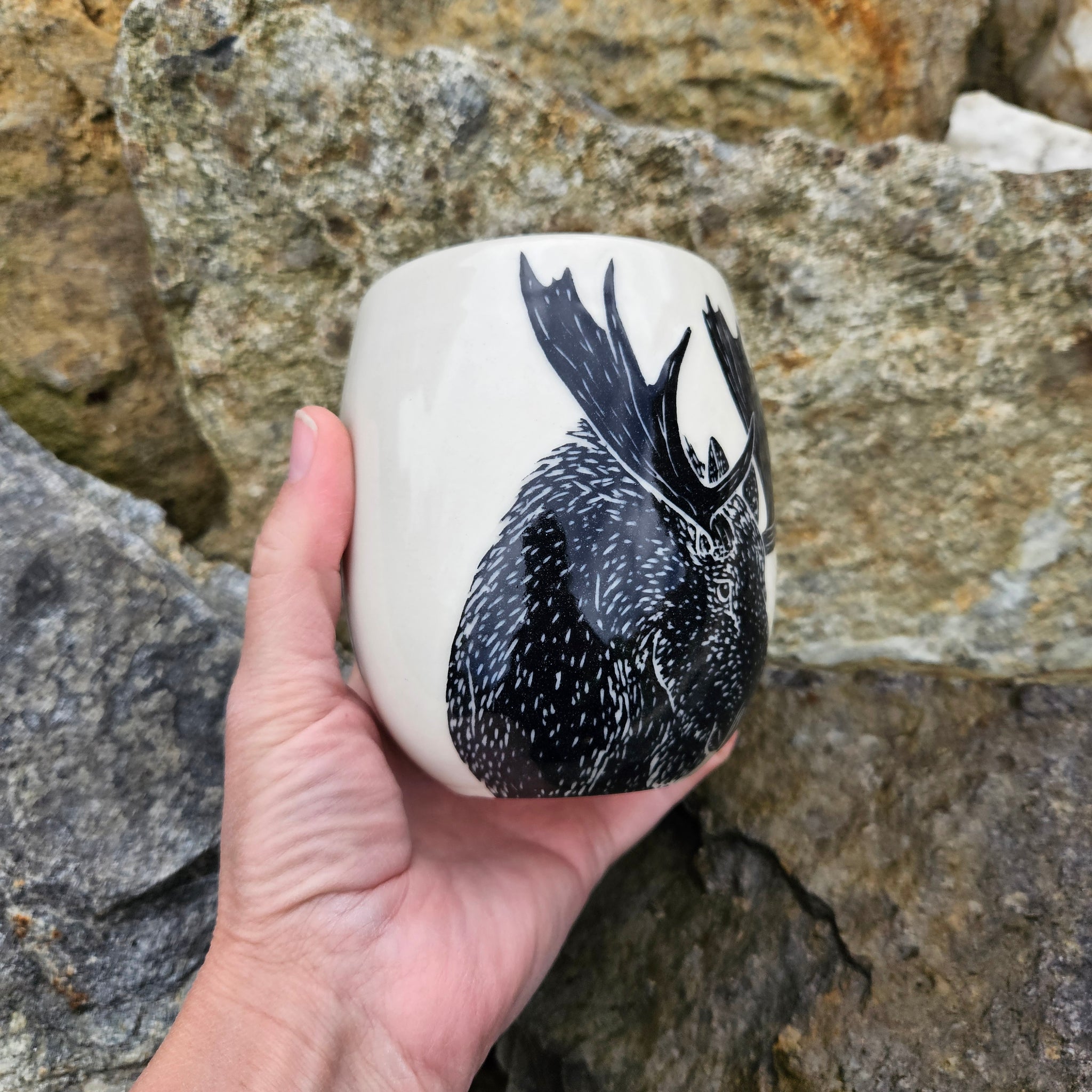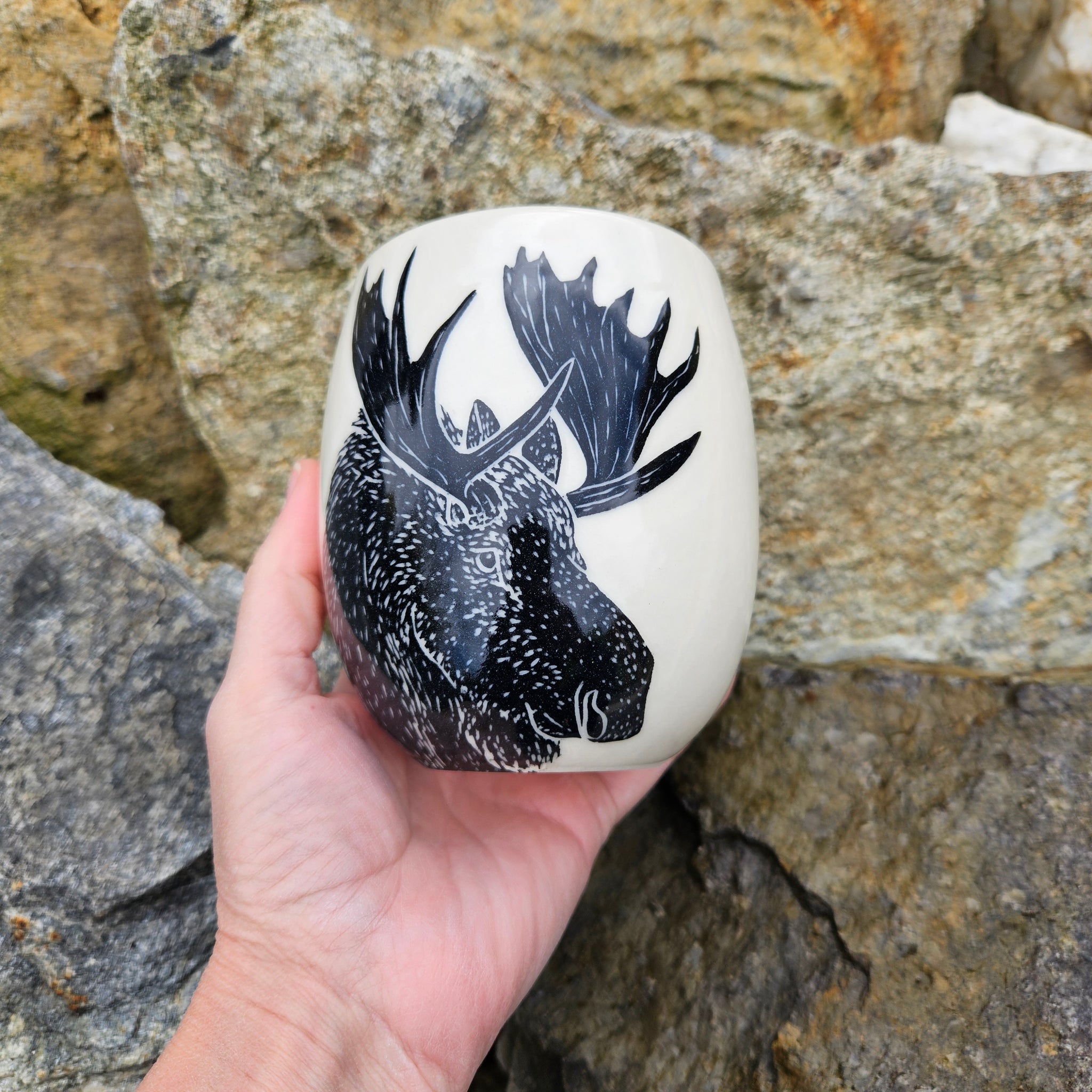 A large ceramic cup hand-etched with a moose.