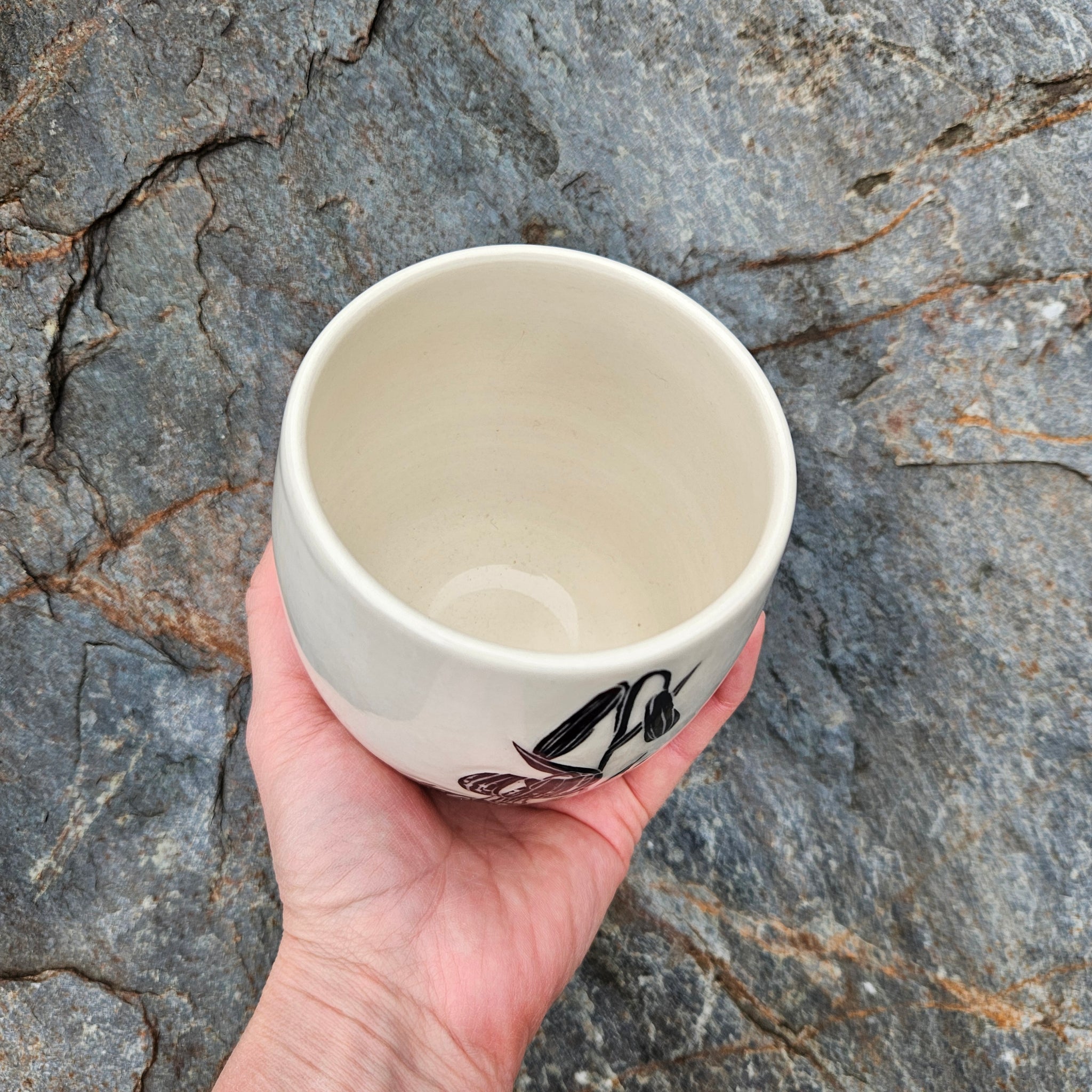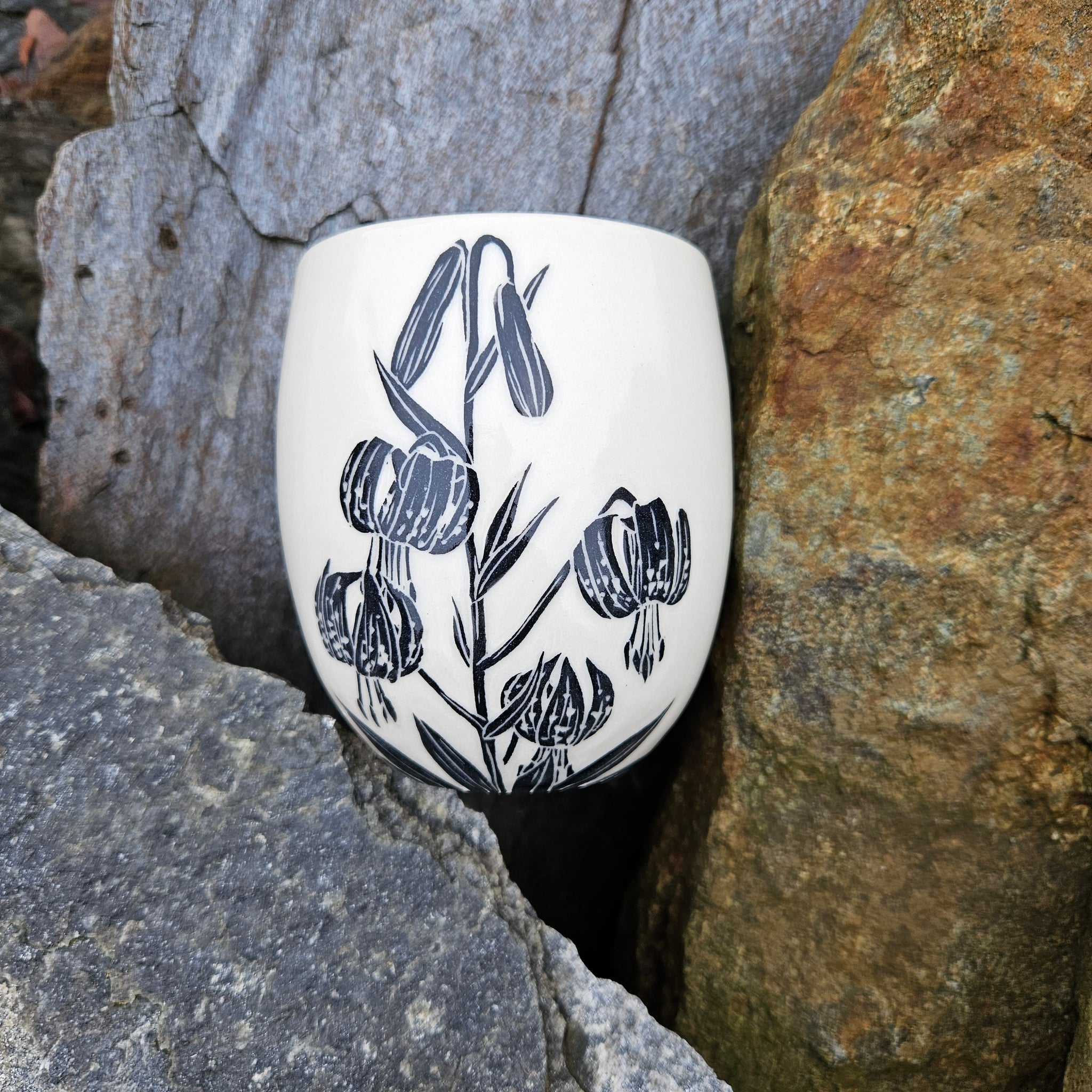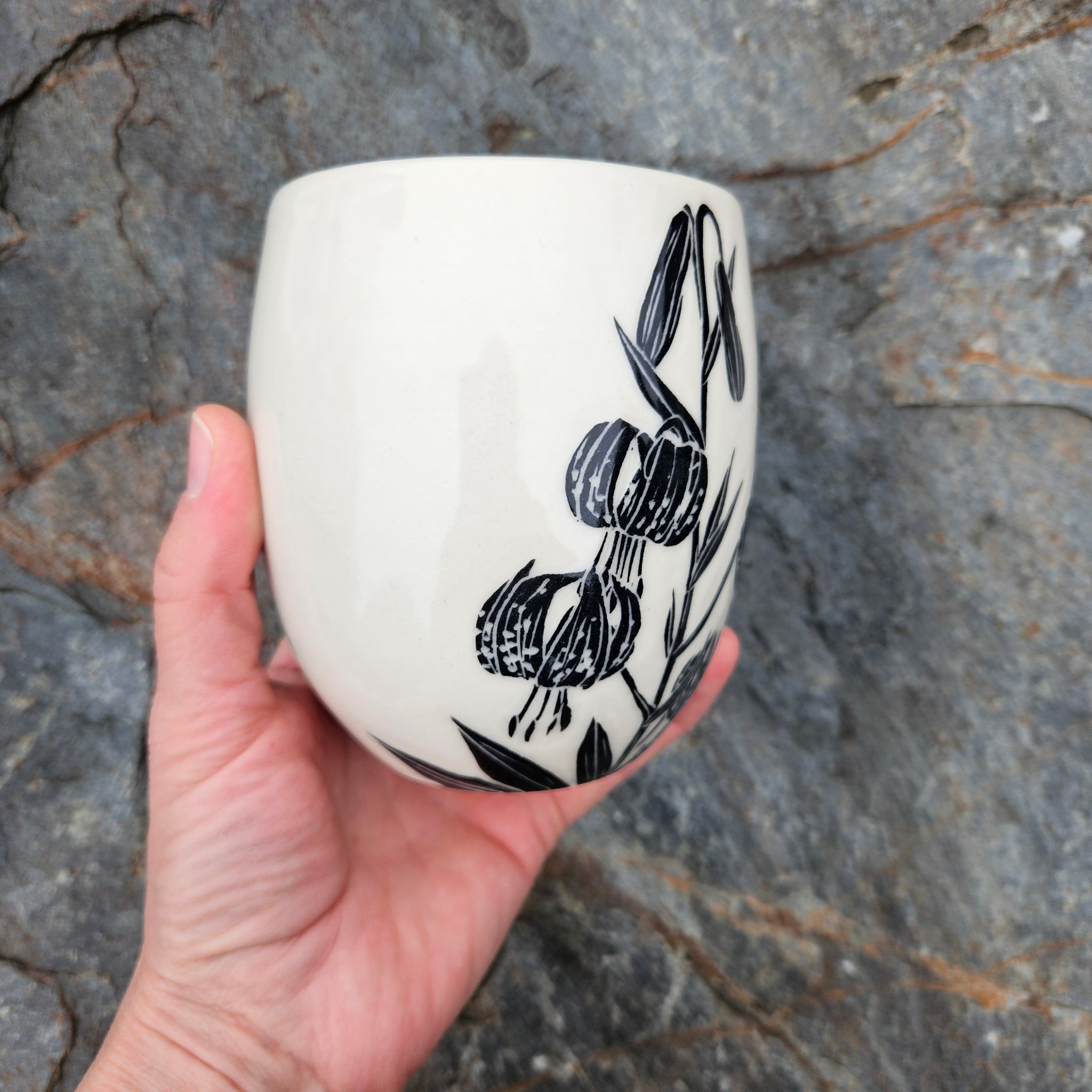A large ceramic cup hand-etched with a stalk of Columbia lily flowers.