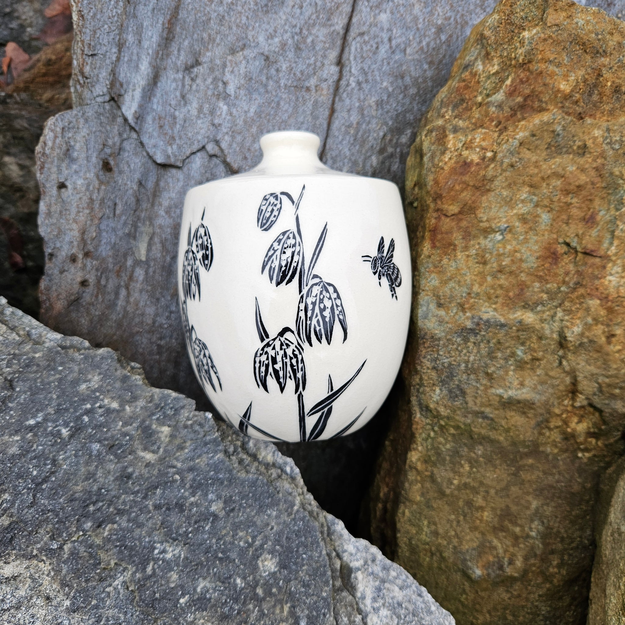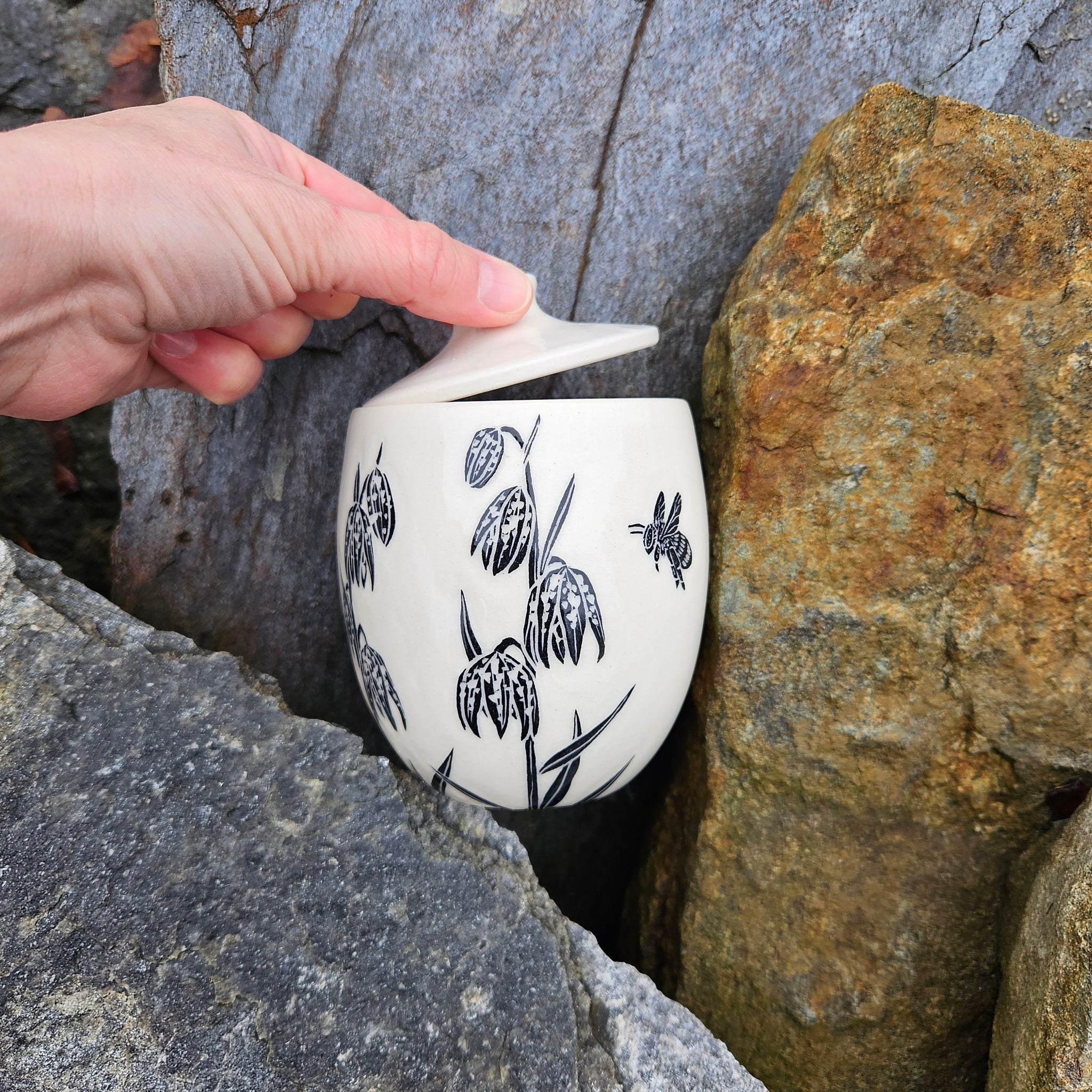 A large ceramic cup hand-etched with two stalks of chocolate lily flowers with a flying bee.