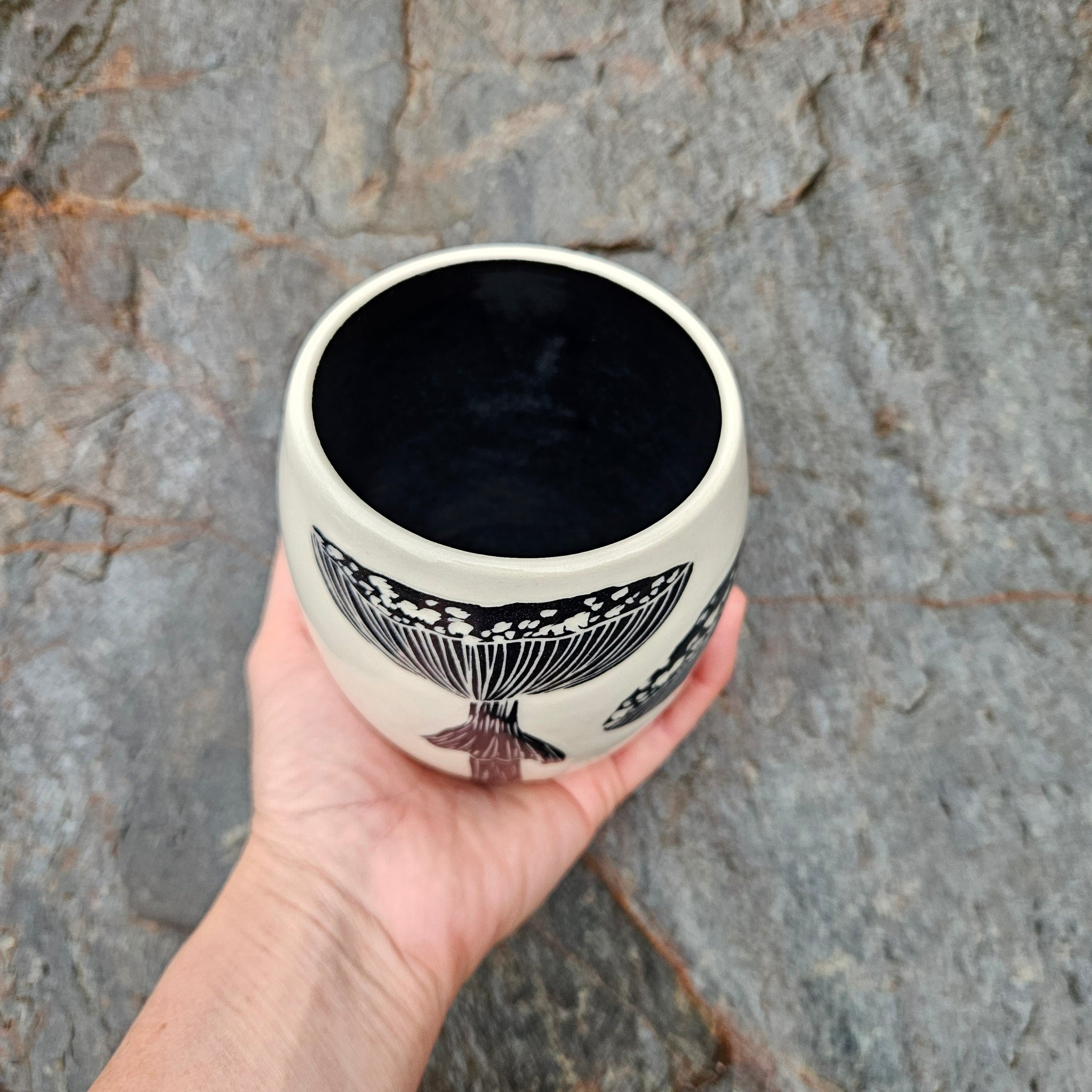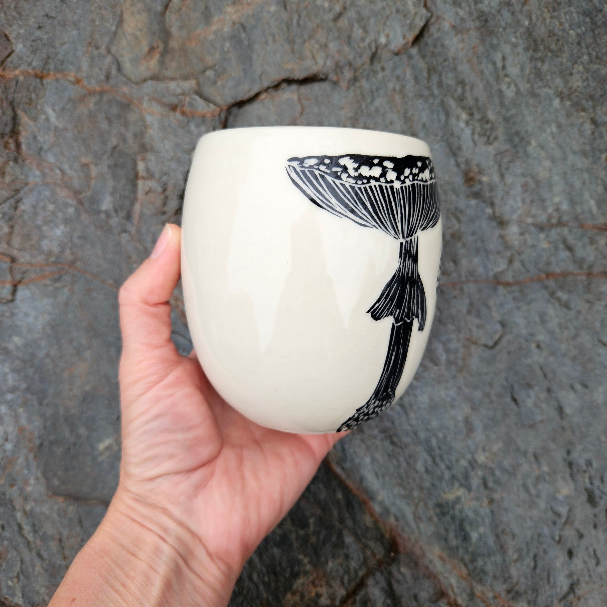 A large ceramic cup hand-etched with two Amanita or fly agaric mushrooms.