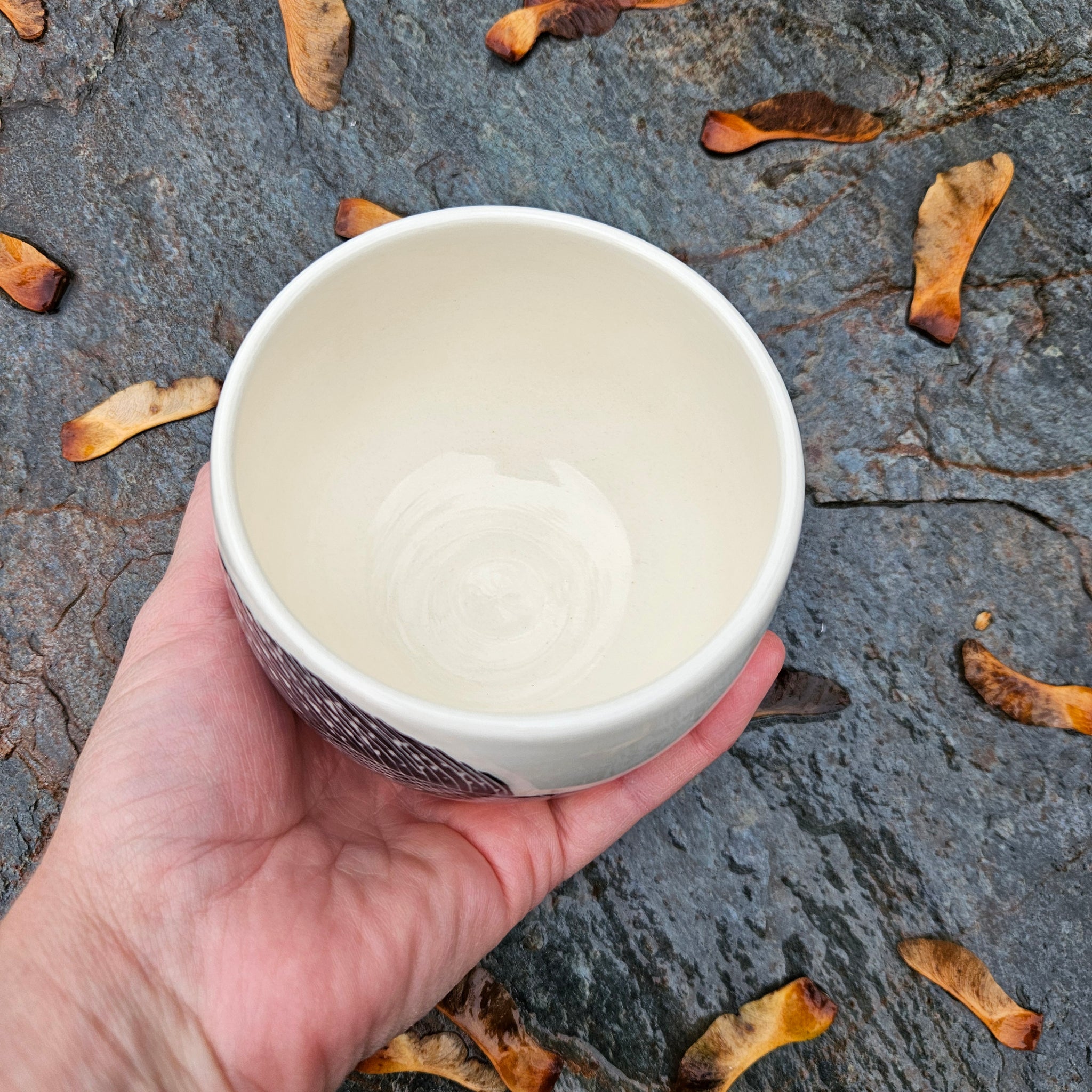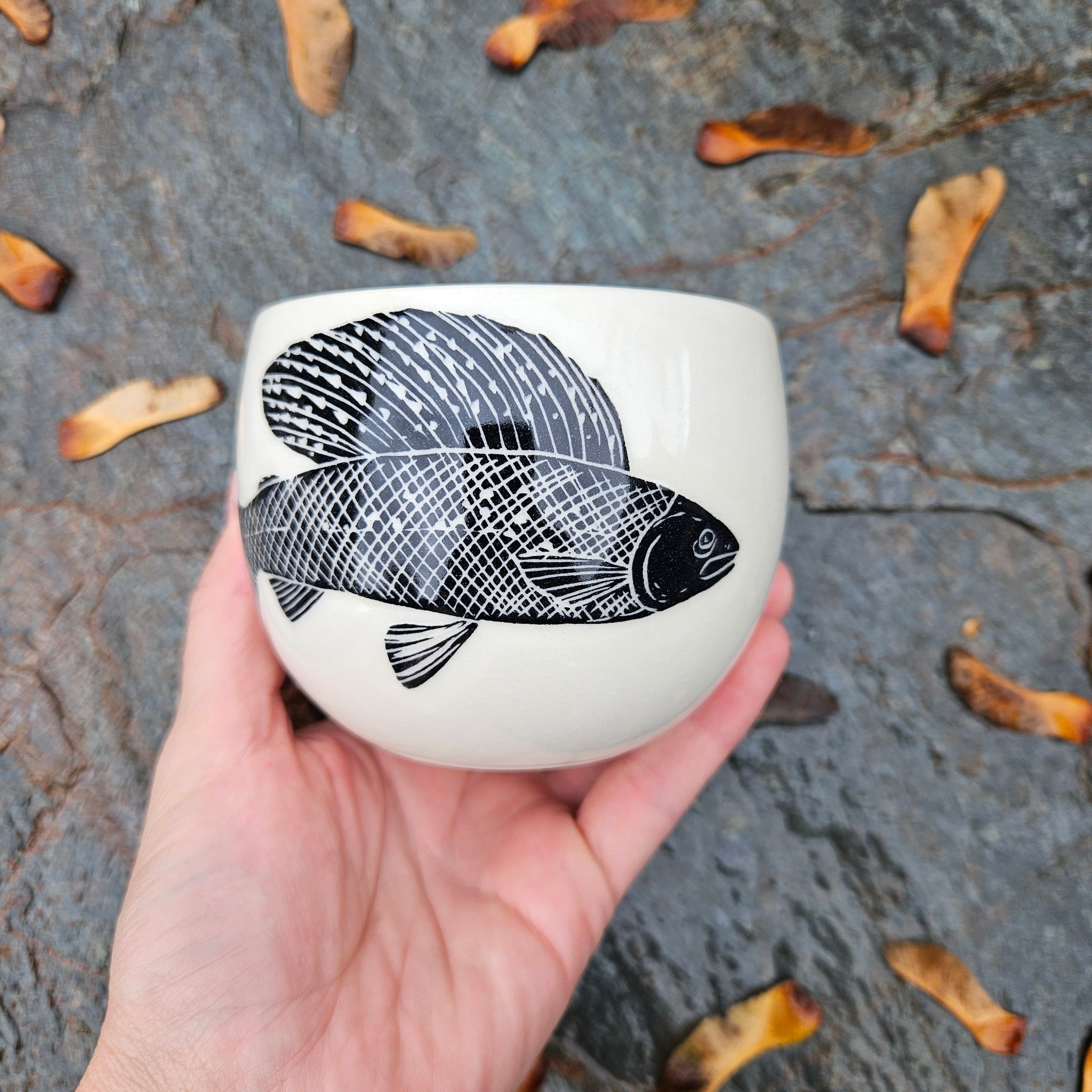 A medium ceramic cup hand-carved with an Arctic grayling.