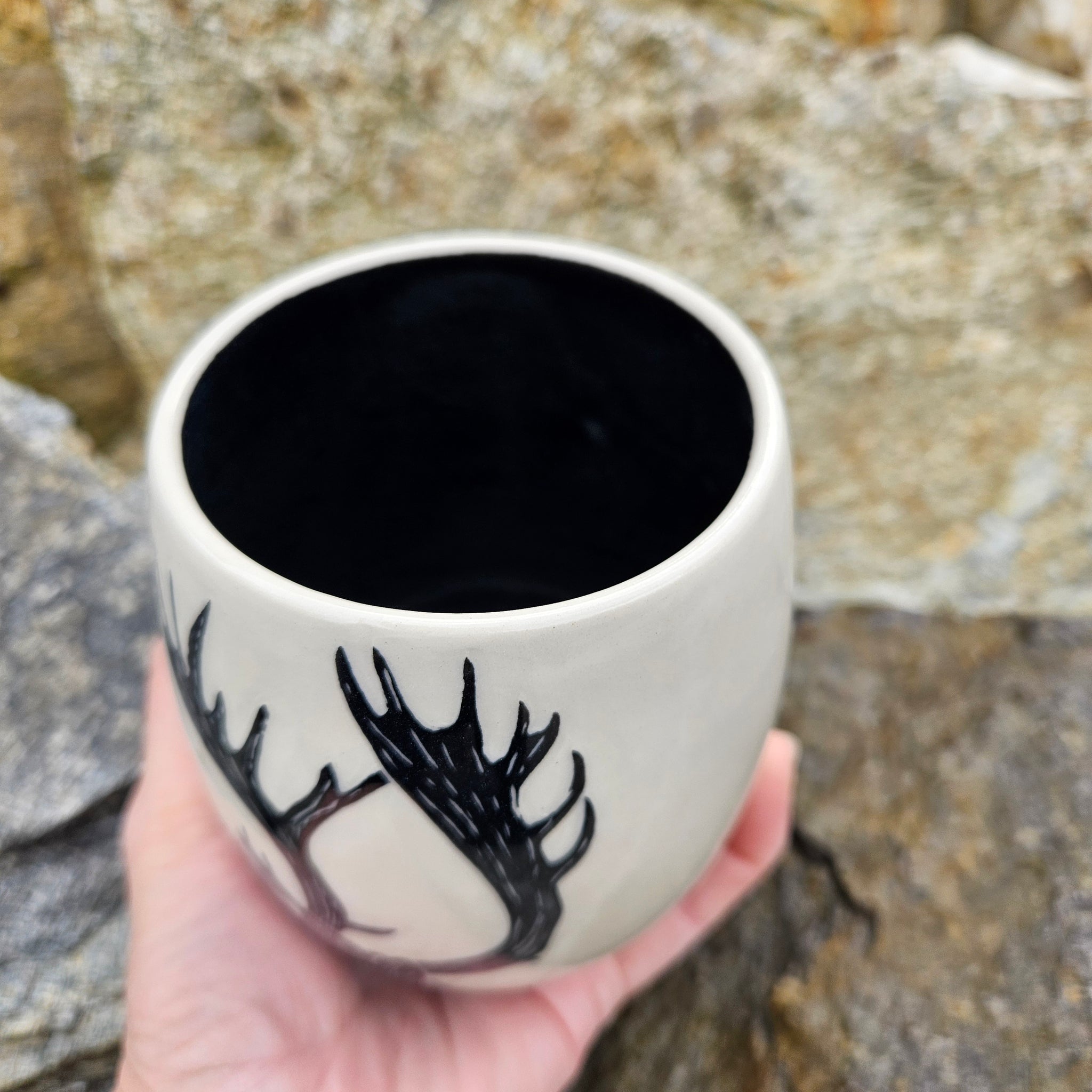 Width: 8cm. Height: 10.5cm*. Volume: 400mL or 13.5oz. Material: white porcelain ceramic. Black interior.