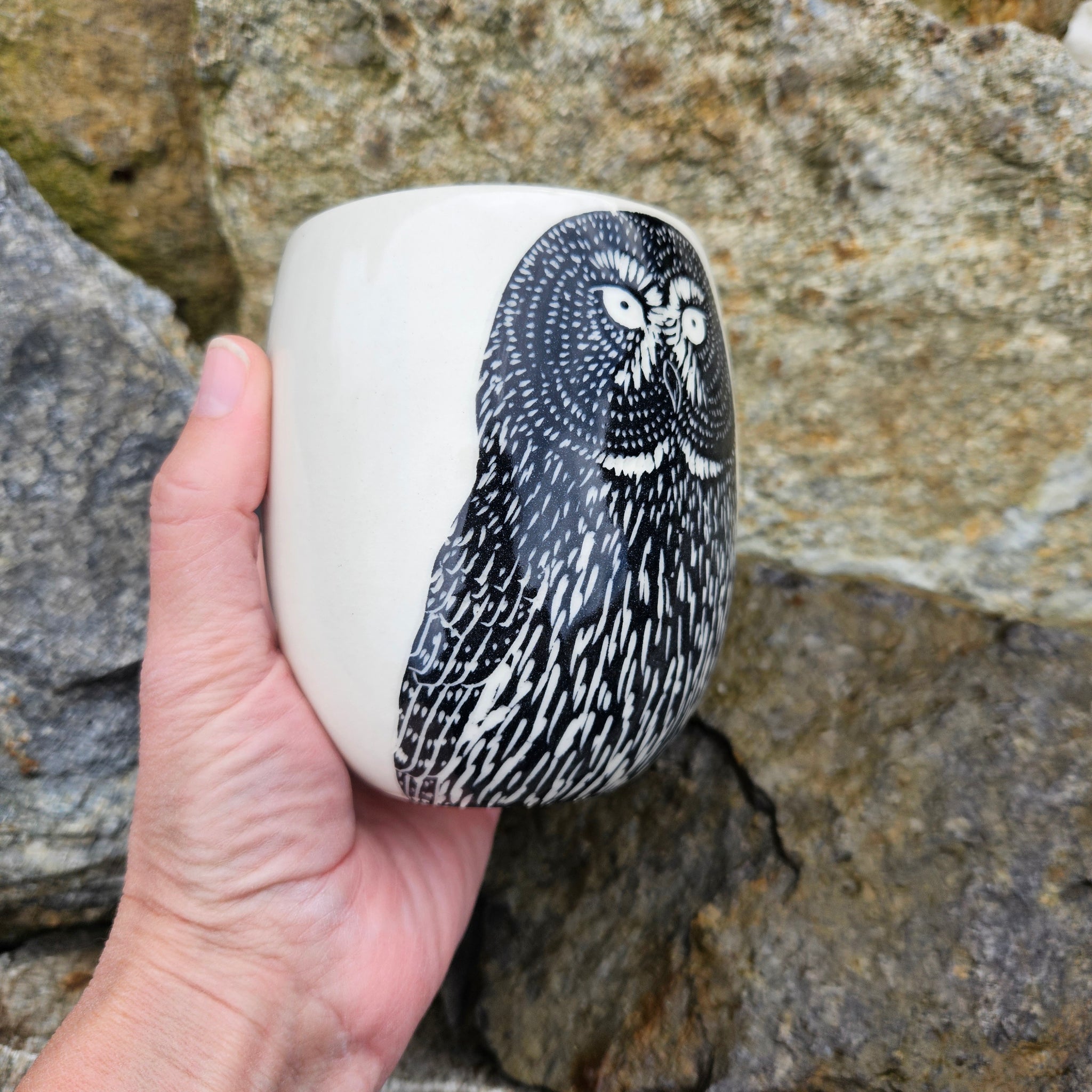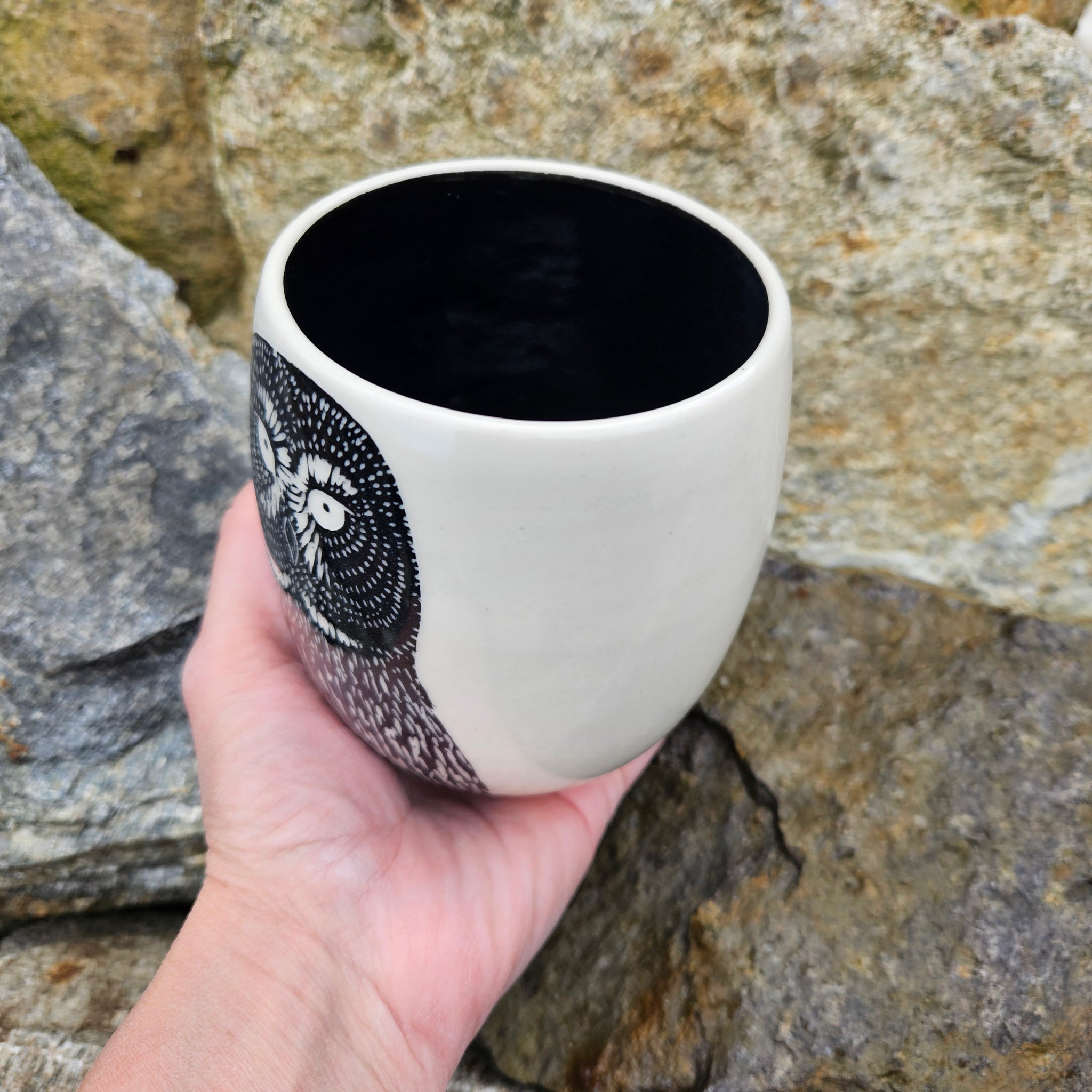 Width: 8cm. Height: 10.5cm*. Volume: 400mL or 13.5oz. Material: white porcelain ceramic. Black interior.