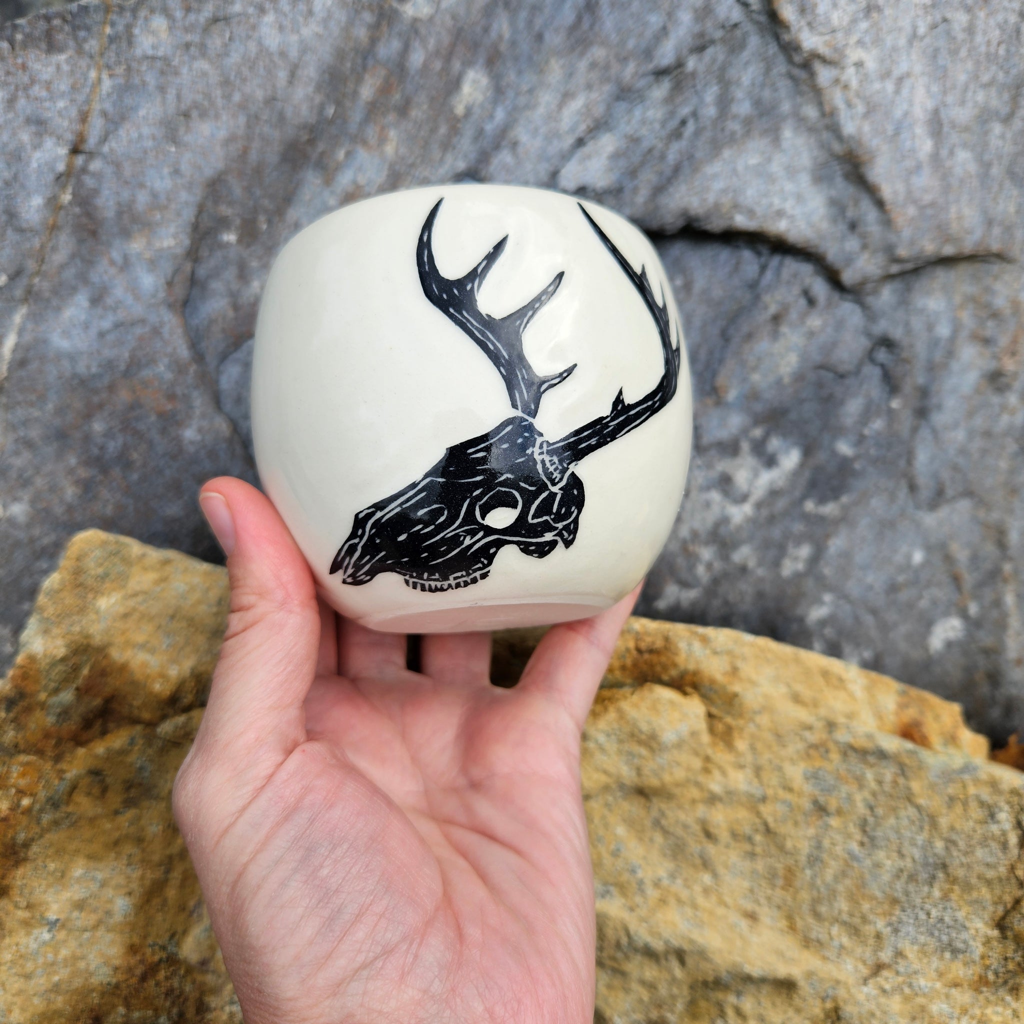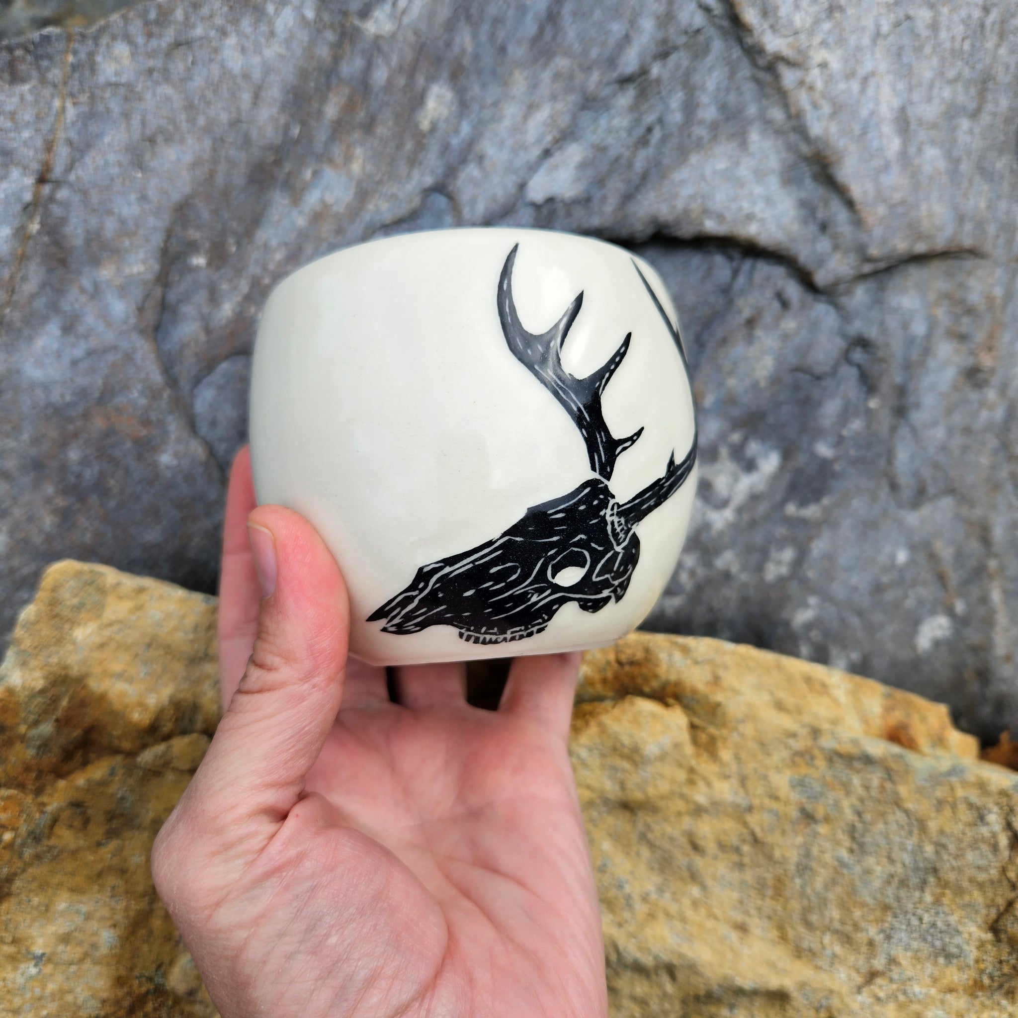 Width: 9cm. Height: 7.5cm*. Volume: 300mL or 10oz. Material: white ceramic. Black interior.